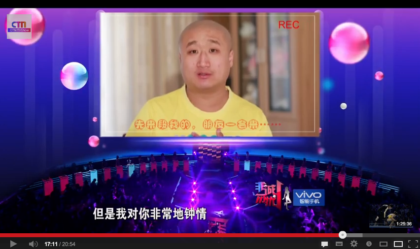 (From left to right) 1) ‘when I saw her, I thought she looks like a chocolate bar‘; 2) ‘I could barely stop myself from biting her‘; 3) ‘Hahahaha‘ (real and fake audience laughter mingles); 4) the other teacher finds it appropriate to intervene in this awkward situation and suggest that ‘it would be a very strong flavour/taste, though‘ (Here you can see the whole Youtube video of Xiao De’s dancing and chocolate remark (Mandarin)).