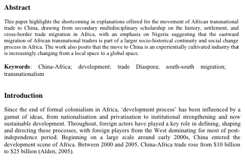 Nigerians Research Moving East: Explaining Aspects of Nigerian Trade to China by Roberto CastilloAugust 5, 2018 Comments 0 By Kudus Adebayo and Femi Omololu for The Journal of Pan African Studies View this document on Scribd Share this: Click to share on X (Opens in new window) X Click to share on Facebook (Opens in new window) Facebook Click to email a link to a friend (Opens in new window) Email More Click to share on Pinterest (Opens in new window) Pinterest Click to share on Tumblr (Opens in new window) Tumblr Click to print (Opens in new window) Print Like Loading... 0 comments on “Moving East: Explaining Aspects of Nigerian Trade to China” Leave a comment Cancel reply Δ Post navigation Previous Post Next Post