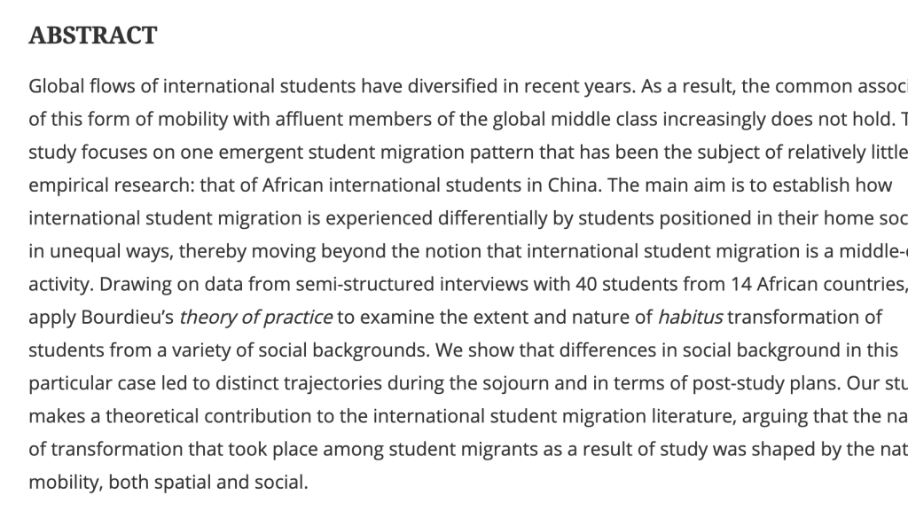 Benjamin Mulvey & Mark Mason (2021) ‘It’s kind of becoming a culture’: how habitus influences the migration trajectories of African students inContinue Reading